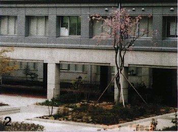 2. 上記の中庭でB2棟寄りの植栽桝にあるシダレザクラ他:平成7年3月卒業の自然研究専攻生命科学コースの学生が在学中からの拠金による。サクラは平成6年初春に高鷲農場からの移植。その前後、根締めにツツジ、ドウダンツツジ、エリカ、アセビなどの木本以外にもカンゾウ、ジャーマンアイリスなど数種の球根が次々に植え込まれた。