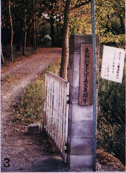 3. 羽曳野市にあった1万坪近くの本学高鷲農場入り口:昭和14年、地元から天王寺師範に寄付された土地。大学になってからも昭和37年迄は職業科の実習地として、38年以降は教材園として主として理学科の教育研究用に供せられるとともに、ここ10数年は附属養護学校の実習地としても活用されてきた。この値に植えられていた数10年生の樹木と18年生のサクラ類の相当数が新キャンパスの各所に移植された。事務局棟とC棟の間の植栽桝の樹木のほとんどが、ここからの移植樹。移植1〜2年前からの根廻しと移植・造園費は「旧天王寺師範植樹の会」からの寄付によった。52年間の先人の生きた遺産と努力を戴いたことを深く心に留めおきたい。平成7年9月22日主計課によりささやかな閉園式が行われた。