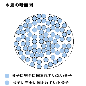 分子は必ず隣り合った分子との間に引力が働いていて,液体の内部ではこの引力は互いに打ち消される。ところが,液体の表面にある分子についてはその分子より外側には分子が無い。よって表面での引力は内向きにしか働かない。(左図参照)その時,表面張力は水滴を球に保とうとするのである。