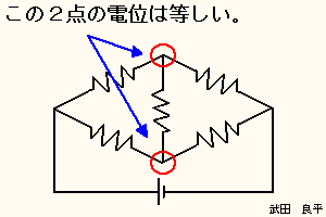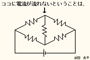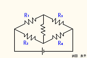 - R1・R4=R2・R3 (向かい合った抵抗の積は等しい)