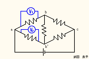 aの電圧は同じで、bとb'の電圧も等しい。よって、abとab'間の電圧は等しい。