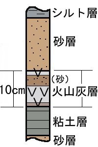火山灰本体の層厚は7cmしかなく、間に3cmの砂(火山灰BASEより