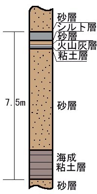 ピンク火山灰は公園に生えている”メタセコイヤ”の真南に位置し、海成粘土はピンク火山灰層よりも