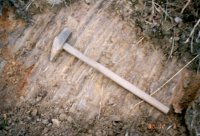写真に写っている紫の部分が海成粘土質で、鉄褐色の部分は砂砂質である。 粘土の部分が紫色を呈しているのはこの粘土層が堆積した当時この地域が還元状態にあった ことをい示している。 また、砂の鉄褐色は海水成分の硫黄や鉄分が溶けだしたものである。 |