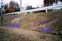 8m程度東側にある。 (海成粘土層がある位置には草が生えていないのでこれを目印として 火山灰層を探すのがよい。) |