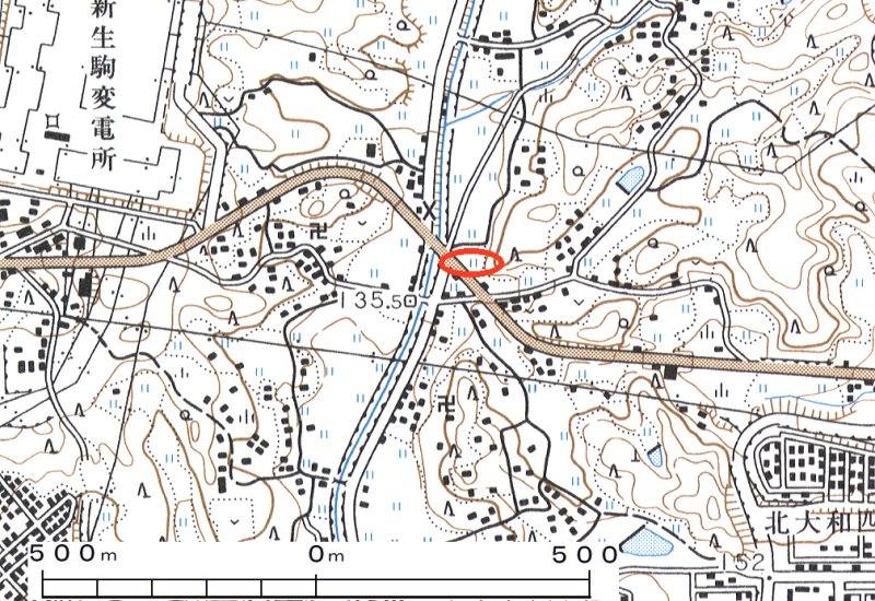 | 国道163号線と県道7号線が交差する”高山大橋”交差点に位置する”奈良トヨタ” 生駒店の裏手の田の中にピンク火山灰層を確認できる。 |