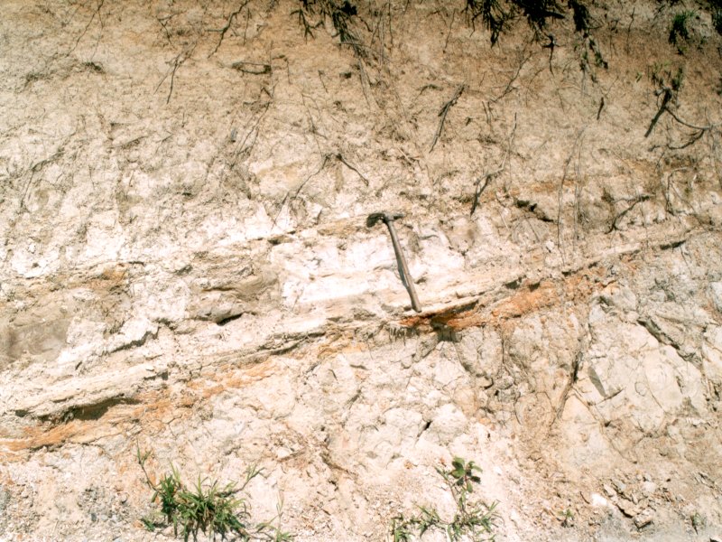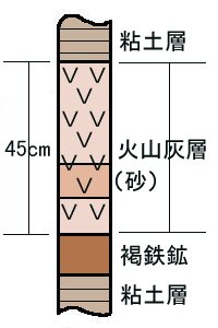 粘土層に挟まれるピンク火山灰層(西へ約14度傾いている)を観察することができるが、ピンク火山灰特有の