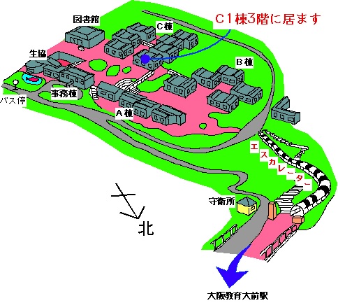 イラストマップ近鉄大阪線「大阪教育大前」駅の改札を出て、なだらかな坂道を上っていくと目の前に380余段の階段が見えてきます。その脇のエスカレーターを3本乗り継ぐとキャンパスです。