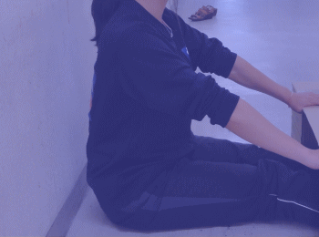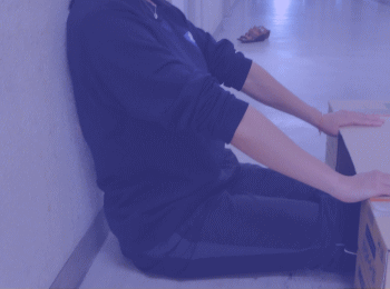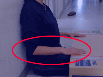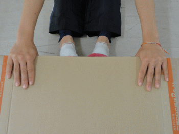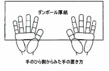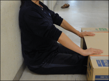 被測定者は、両足を両箱の間に入れ、長座姿勢をとる。壁に背・尻をぴったりとつける。ただし、足首の角度は固定しない。肩幅の広さで両手のひらを下にして、手のひらの中央付近が、厚紙の手前端にかかるように置き、胸を張って、両肘を伸ばしたまま両手で箱を手前に十分ひきつけ、背筋を伸ばす。 |