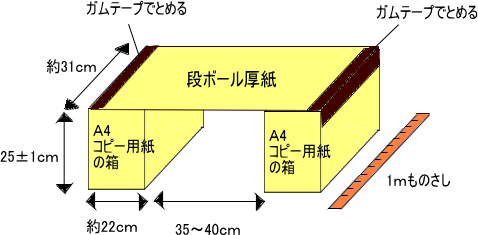 1m巻尺または1mものさし 幅約22cm・高さ約24cm・奥行き約31cmの箱2個、 段ボール厚紙1枚(横75〜80cm×縦約31cm)・ガムテープ *下図参照* |