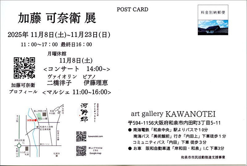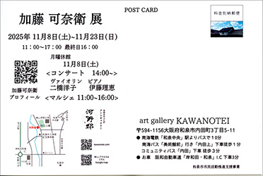 11月8日(土)〜23日(日)、加藤可奈衛教授の個展が、art gallery KAWANOTEIにて開催されます。ぜひご来場ください。