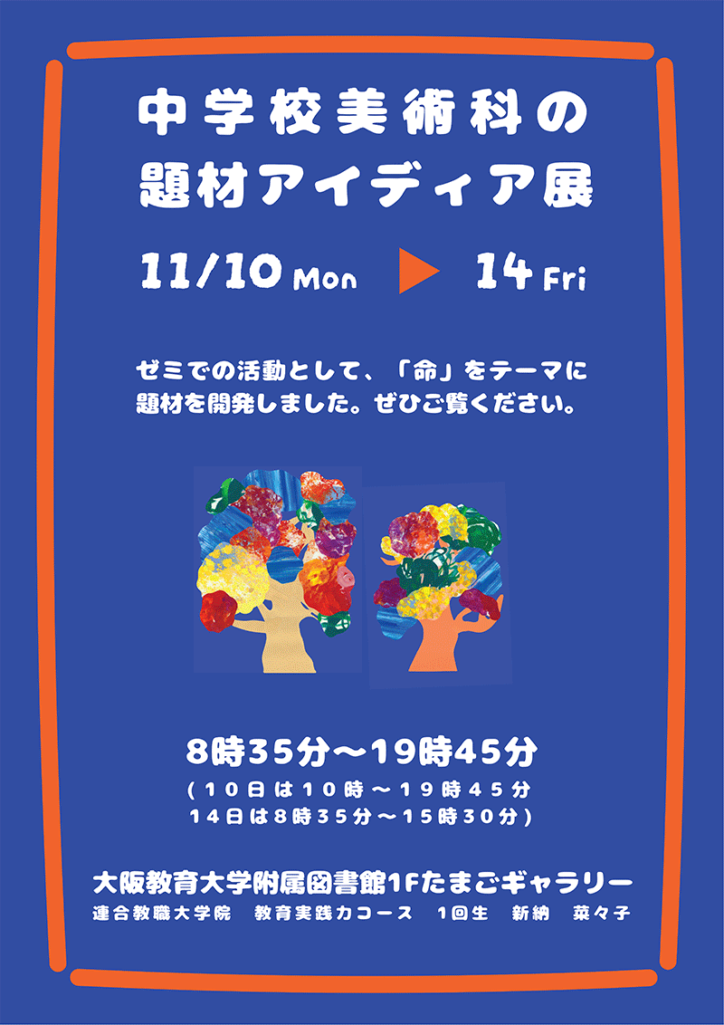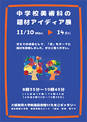 11月10日(月)〜14日(金)、大阪教育大学附属図書館たまごギャラリーで、教職大学院教育実践力コース1年の新納菜々子さん企画による「中学校美術科の題材アイディア」展が開催されます。ぜひご観覧ください。