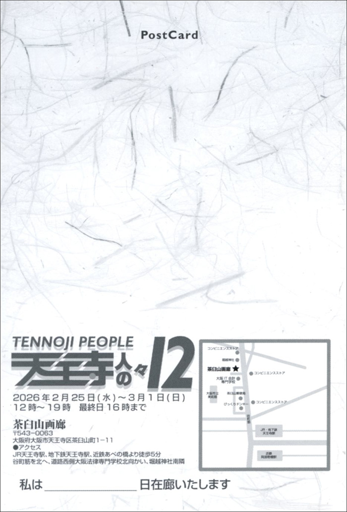 2026年2月25日(水)〜3月1日(日)、茶臼山画廊で開催される「天王寺の人々 12」展で前特任准教授の青木宏子先生と美術教育コースの学部生・卒業生が作品を展示します。ぜひ、ご来場下さい。