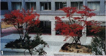 1. B2棟とB4棟間の中庭の約50年生の3本のイロハモミジ:古くから親しまれてきたカエデで、新芽から落葉まで四季の風情を演出する。この列に対して3本のやはり50年生のサザンカも植えられた。いずれも高鷲農場のものを平成5年初夏根廻しし、平成6年初夏に移植。教養学科教官の拠金による。