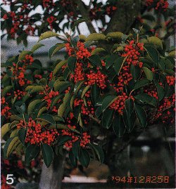 5. たわわに赤い実をつけたモチノキ:音楽棟・美術棟と、図書館・大学会館の間の中央の植栽桝に、平成5年春植えられた。美術科教官・卒業生有志の寄贈樹。