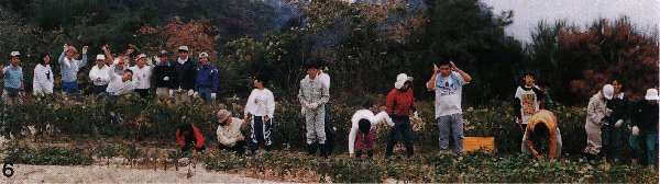 6. 仮農地:北西進入路を上って、周回道路を右へ仮駐車場の西側谷筋の上段部に設置されていた仮農地(教材園)での附属養護学校高等部生徒のサツマイモ掘り作業。この地は、理科教育・技術教育・自然研究講座、生活科の授業研究用と、附属養護学校の実習地として、臨時に設けられたが、この森の隣接場所に教職員宿舎の建設が始められる。教材園は今年3月から事務局棟北側台地の奥に設けられた新教材園に移った。