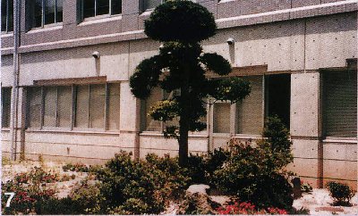 7. C3棟東側の中庭:平成7年春「旧天王寺植樹の会」による寄贈。立派なマキノキに数種の根締め用低木が植え込まれた。同会の拠金によって、他にC1棟西側の庭と図書館東側建物下のエリカ列植も可能となった。