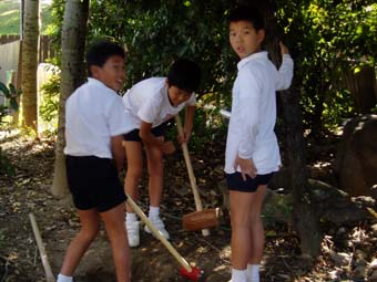 池をきれいにするために、落ち葉を集めることもしました。 |
