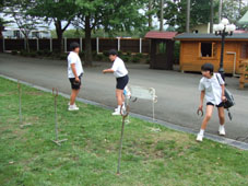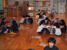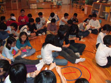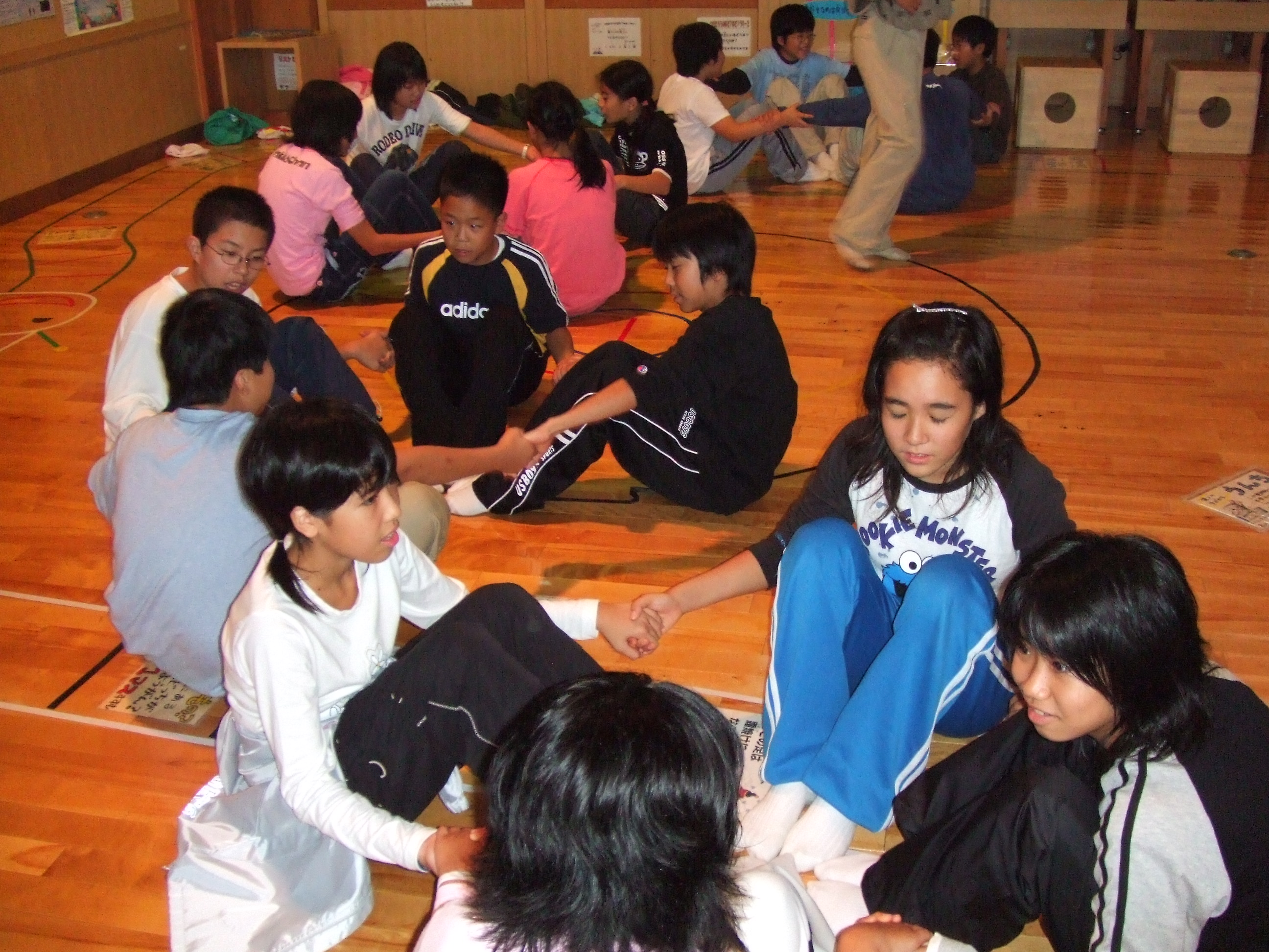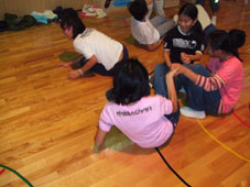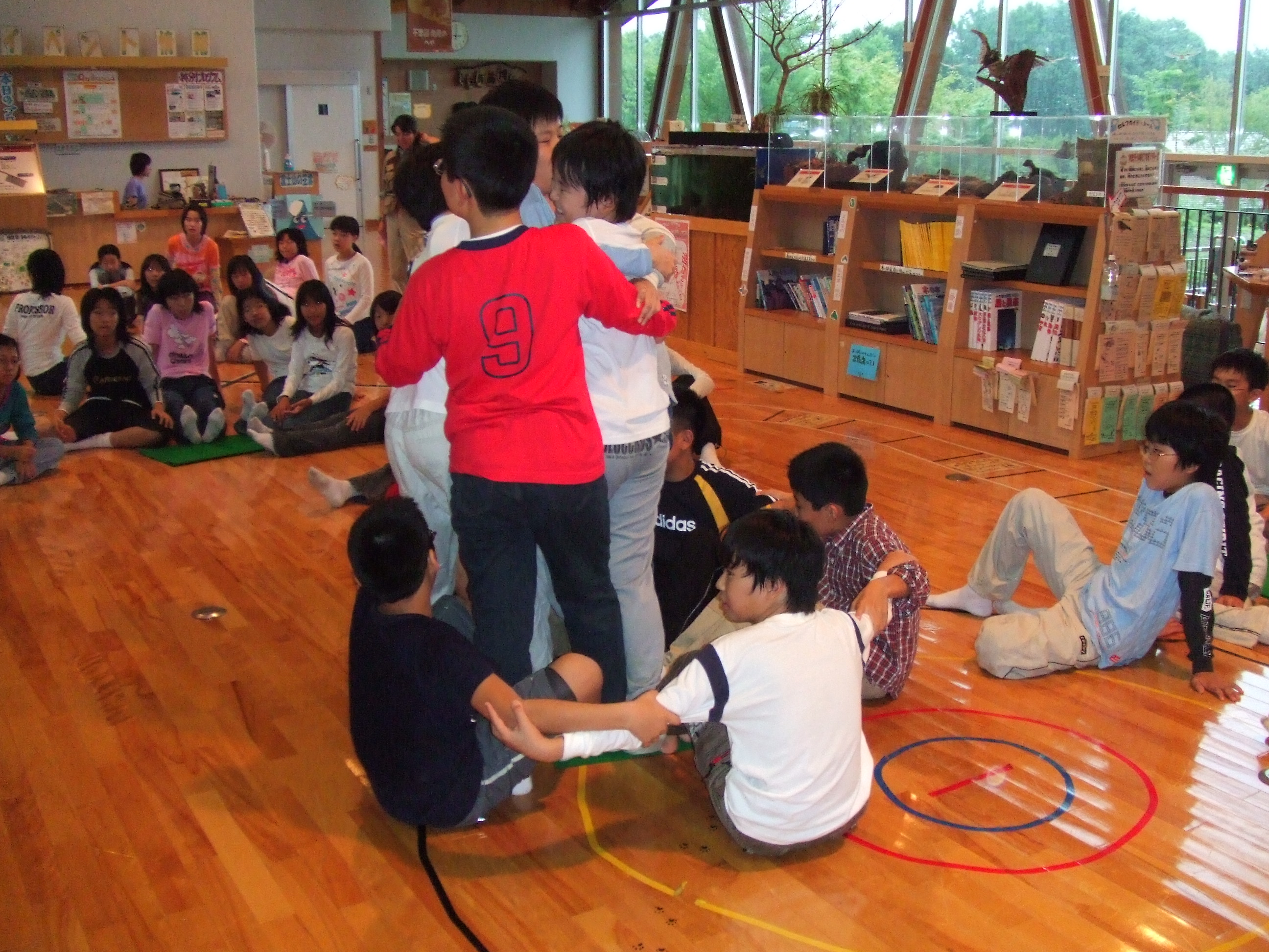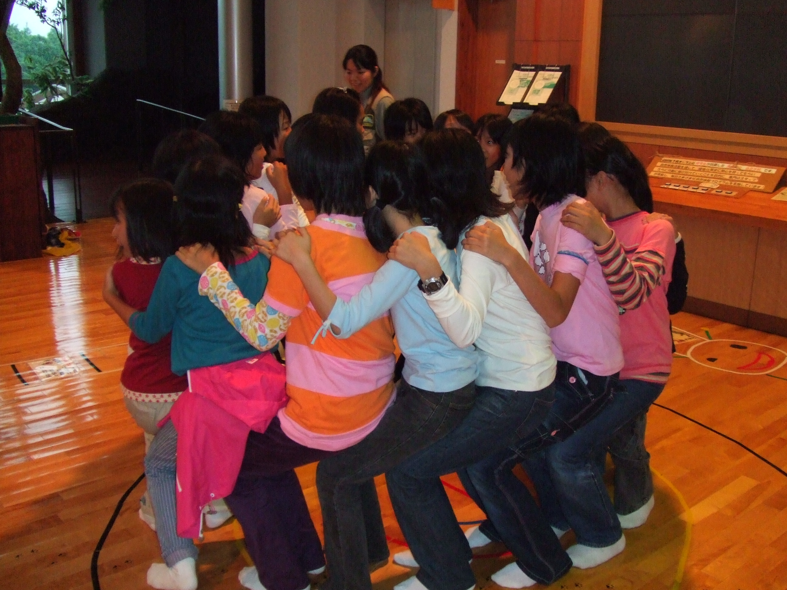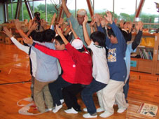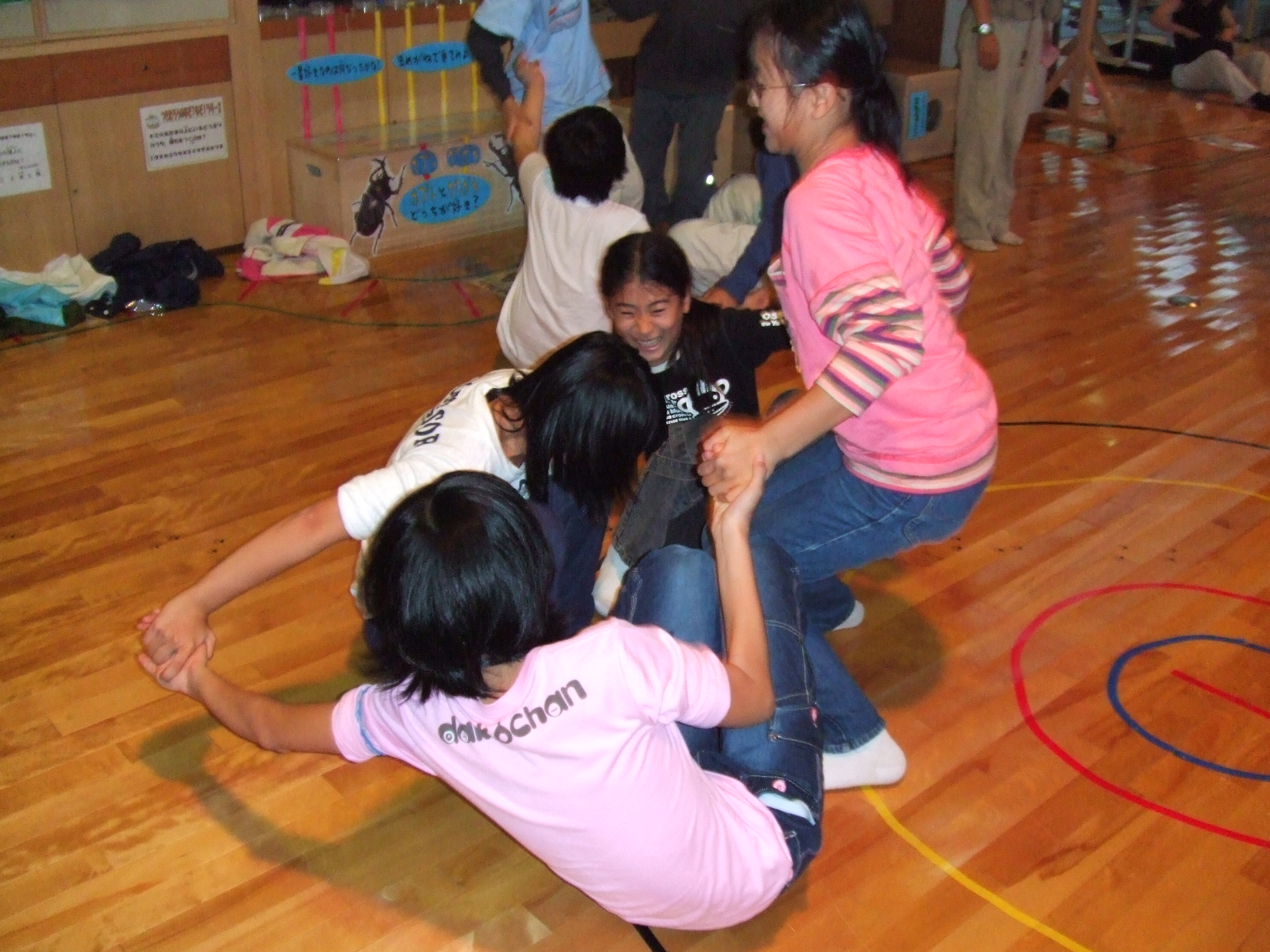 雨だったので、屋内でゲームをしました。 4人で同時に立てるか…チームワークが試されます。 |
