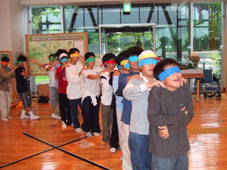 みんな!目をつむって!! そして、前の人の肩を持って前に進むよ。 |