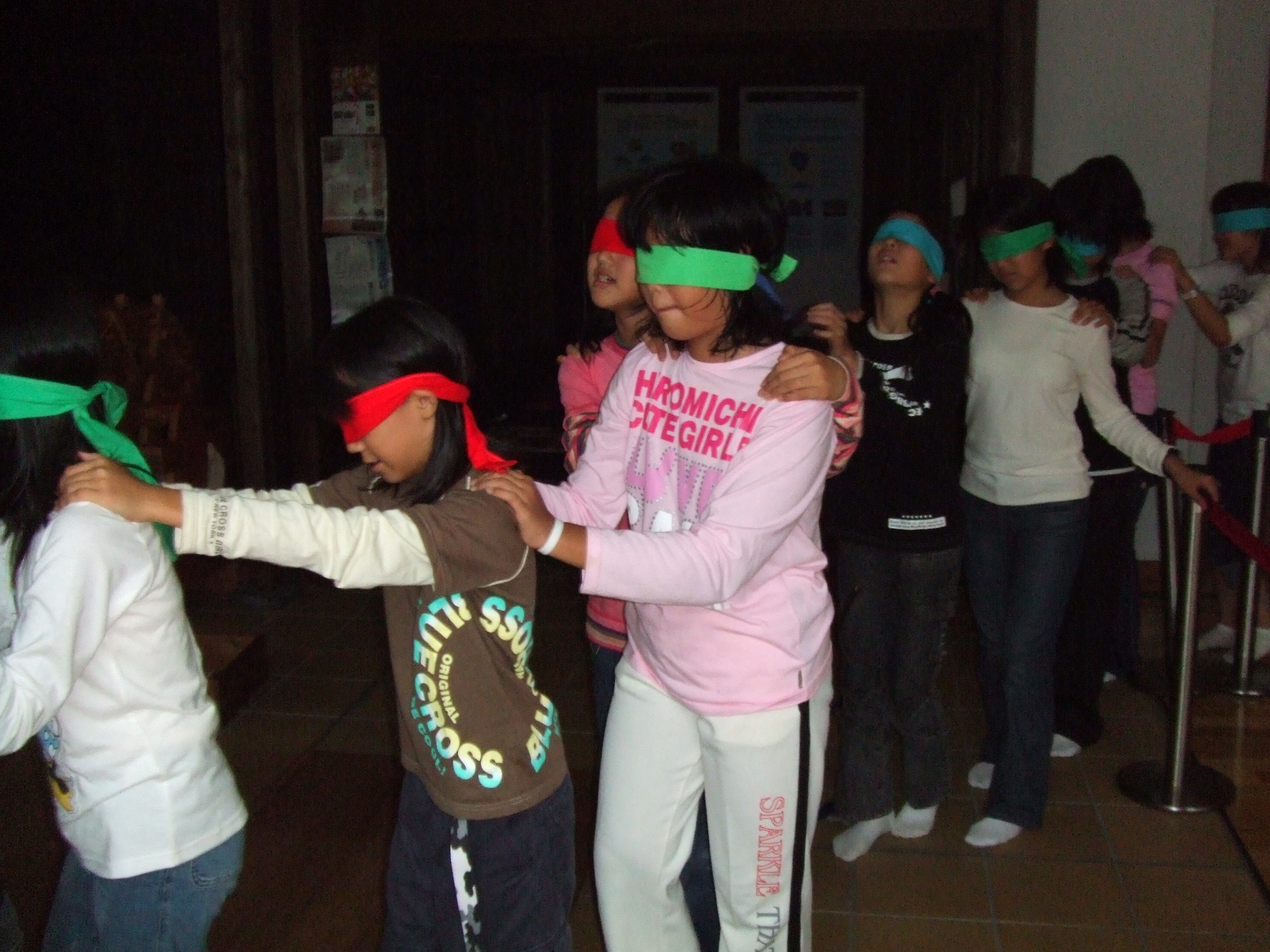 みんなで目隠しして、体全体で雰囲気を感じとってどれだけ歩けるのかも、やってみました。 自分たちは、目に頼っていることが多いことを実感しました。 |