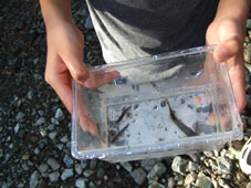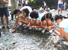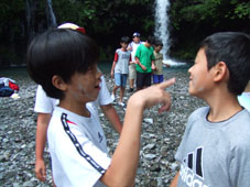 | 音の鳴る石を、ハラエモンさんと一緒に探しました。 | |