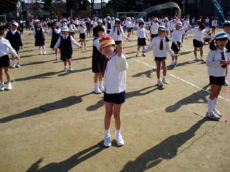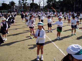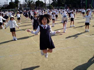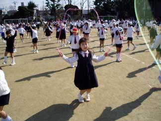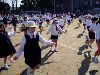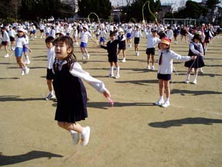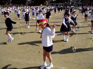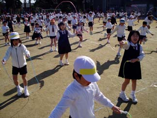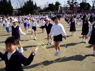 | 今日はいい天気。 | 全校児童が集まって、なわとびに挑戦です |