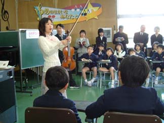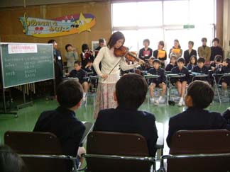 | 関西の各交響楽団、室内楽、レコーディング等幅広くご活躍のバイオリニスト桑原瑶子さんと、ピアニストの岡さゆりさんをゲストティーチャーにお迎えしました。 | 実際に音で、バイオリンのこといろいろと教えてくださいました。 |