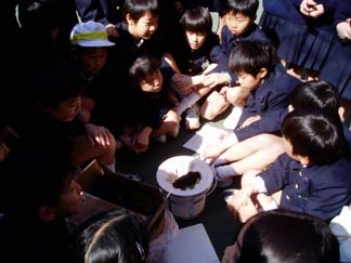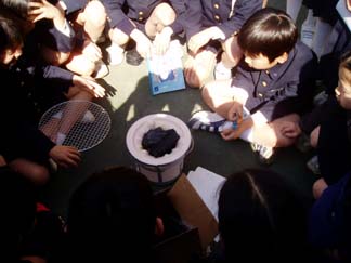| まだ新品です。しくみや材質をさわってたしかめましょう。 | さあ、炭をいれましたよ。みんなはかんたんに火がつくと思っている様子… |