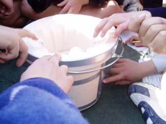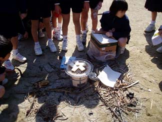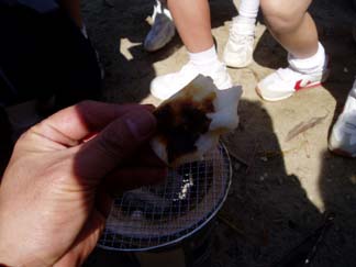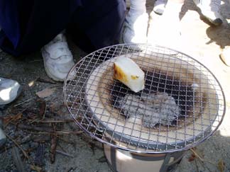 | 火をつけるのにものすごく苦労しました。昔の人の生活の大変さがわかりました。でも、おもちはホントにおいしかった。おもちの中からぷくっとふくれてきて、何もつけていないおもちだけれど子どもたちもおいしいおいしいと言っていました。炭火の魔力にとりつかれそうです。おいしい! | |