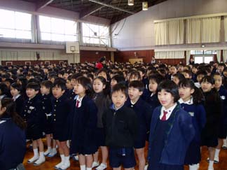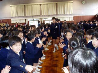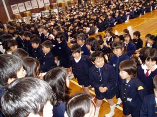| 友達班で給食をたべたあと | 体育館で「お別れ式」です。 |