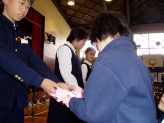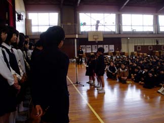 | 3年生代表は山形くん。心をこめて読んでいました。 | そして 卒業生からも贈り物をいただきました |