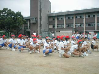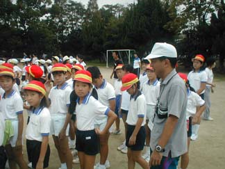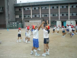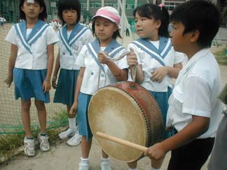 見学者も大活躍です。骨折していても、ぼくは太鼓で合図をおくる役目をします。 私は、みんなの演技をみていて気がついたことをアドバイスします。 |