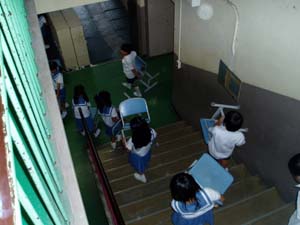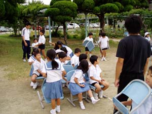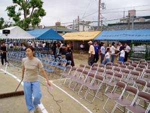 | 保護者席の運び出しです。 | バケツリレーならぬ、イスリレー。 |