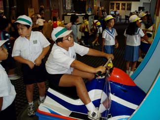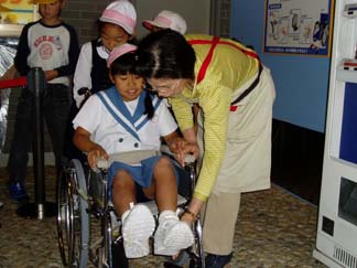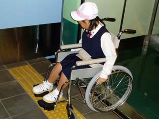 | ここは、バリアフリー体験ができるところです | さあこうやって乗るのよ。 |