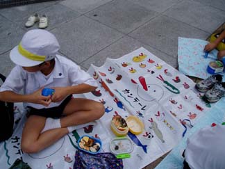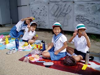 | 外の扇町公園へ行くのも、班の自由です | お弁当タイムも班活動です |