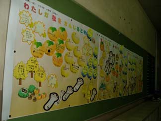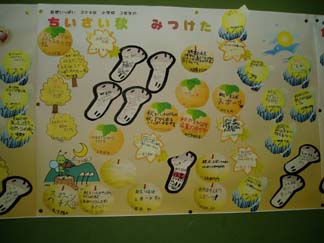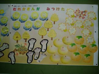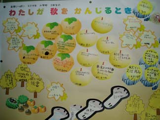 一つ一つのパーツに子どもが、秋の好きなわけや秋をかんじるときなどのコメントをかいています。10月いっぱいの掲示です。