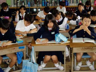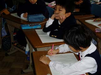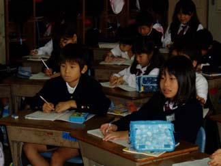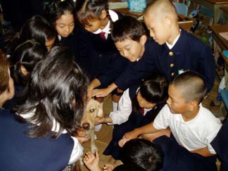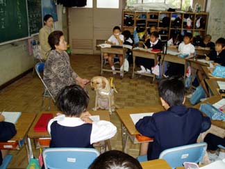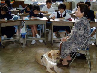 今日は、実際に盲導犬を使っている方と、盲導犬に学校まできていただいて、目の不自由な方や盲導犬のことについてお話をうかがいました。 (今日は1組です。2組と3組は26日にお話を伺う予定です) |