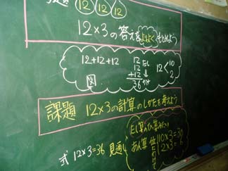 | 複数で授業を進めることをティームティーチングといいますが、いまこのような授業形態が注目されています。 | 今日の課題は12×3の答えをよりよくもとめようですね。 |