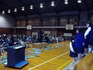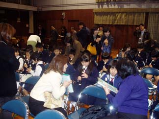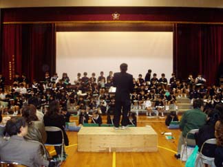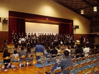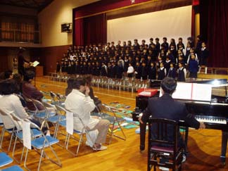 | 続いて2時間目も保護者参画型音楽会公開練習です | まずは、演奏曲を歌ってみました。全校合唱曲「夢の世界を」を歌っているところです。 |