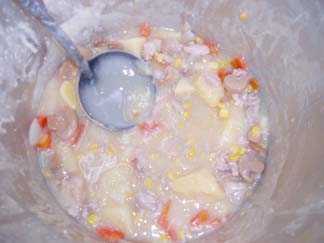 | デザートのゼリーどうぞ | クリームシチュー入れるの上手! |