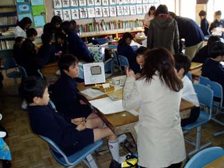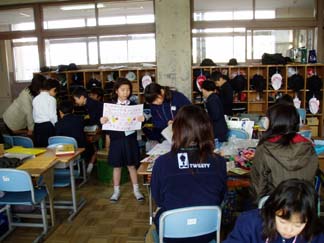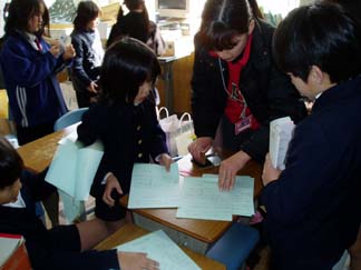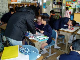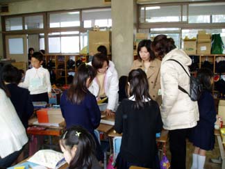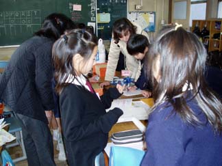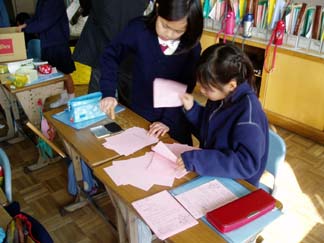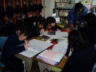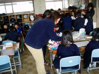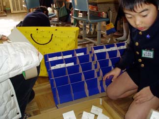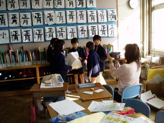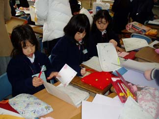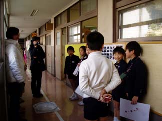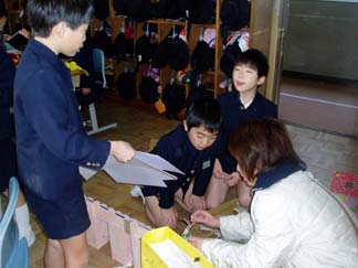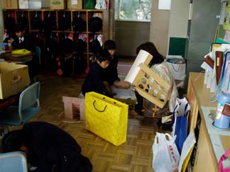 | くばるチラシには学校名が必要なんだって…。出発前にあわてて、スタンプ押し 押し 押し! | こちらもスタンプ スタンプ 大阪教育大学附属平野小学校!! |