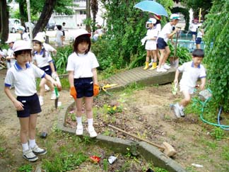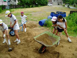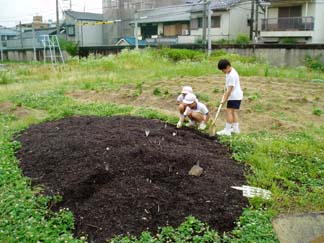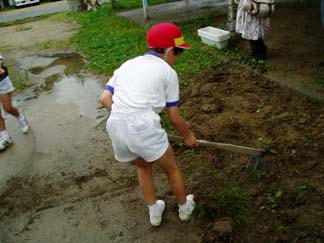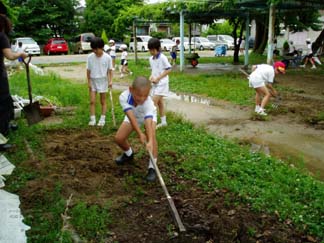 | ふじ棚花だんづくりも順調 | くわの使い方も上手になってきました |