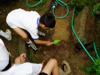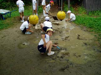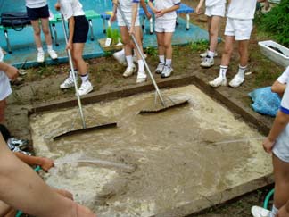 | しばふはどうすれば植えられるの?? | 着地地点はいつも水たまりだから、今日は土でうめよう。 |