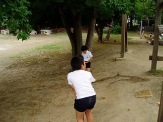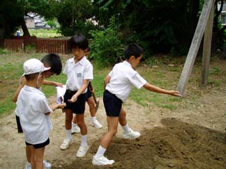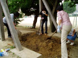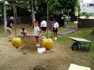 | 土を平らにする工事中 | ターザンロープの着地地点に「クローバー」をうえるんだよ。 |