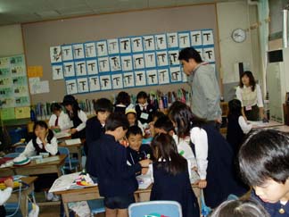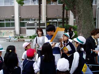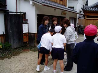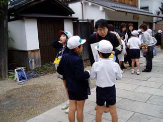 | 今日もたくさんの保護者の方々が直接参画におこしです。中央ロビーで、もう教師用とほとんど、かわらない「指導案」で打ち合わせです。 | 教室では、今日、外へ出るにあたっての注意です |