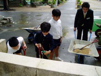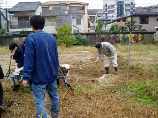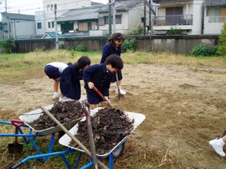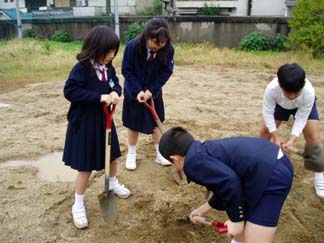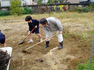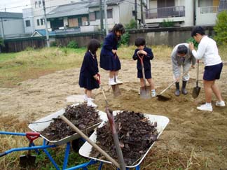 | 外では、伝統野菜名人が実際に畑をたがやして子ども達に教えてくださっています | さあ、がんばるんだよ。腐葉土はどうするの? |