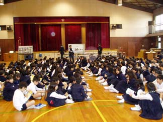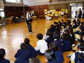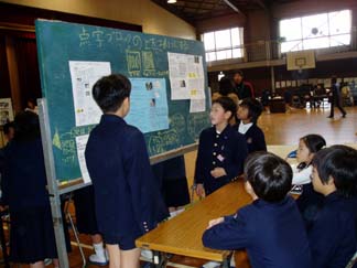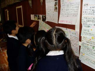 | 身を乗り出して聞く3年生の姿!(上空ヘリコプターより) | 壁の展示も、くわしくてわかりやすくて… |