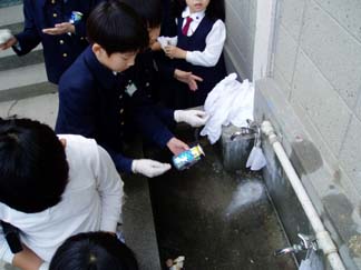 | 手袋して洗ってます | そして、体育館の中へ、真剣な対応です |