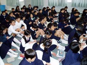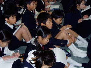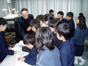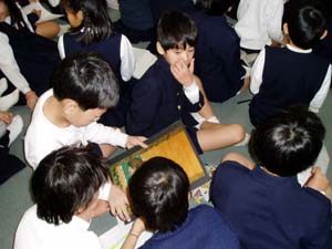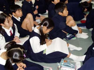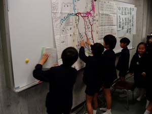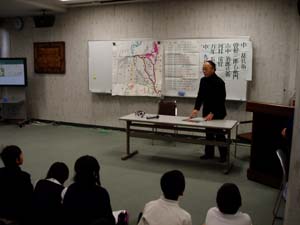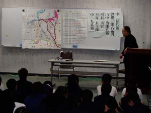 | 熱心に話を聞く子らの様子 | 地図や年表を使って詳しく教えて頂きました。 |
